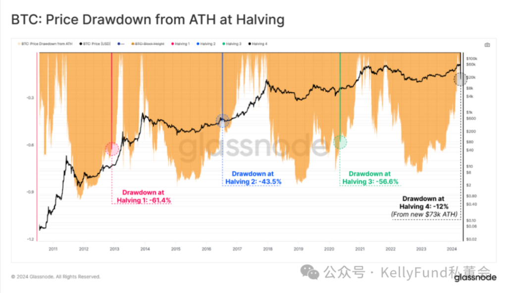 虽然总的来说,在每一次减半事件之后的一年市场总体走势都很强劲,但此过程中,市场仍然会出现一些非常大幅度的回撤,其最大幅度从 30% 到 70% 不等。