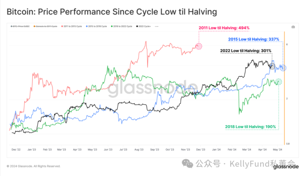 我们现在来评估自上个周期低点直至减半时比特币的价格表现,我们注意到 2015 年和 2018 年的情况与当前周期存在明显相似之处,它们均经历了约 200% 至约 300% 的增长。