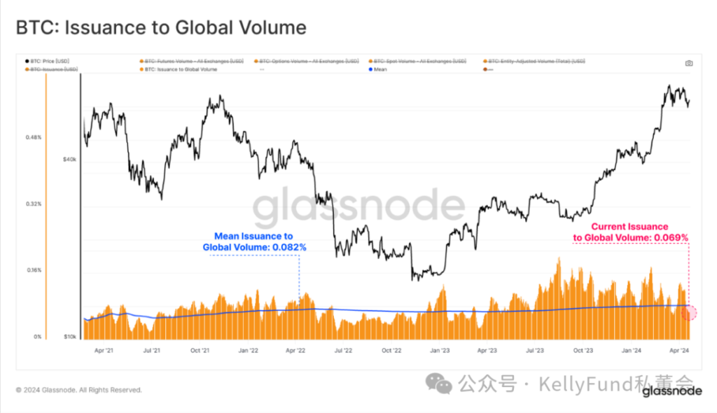因此,比特币减半对可用交易供应量的影响在各个周期中都在减弱,这不仅是因为减半之后𫔭采的比特币数量在不断减少,还因为围绕它的资产和生态系统规模仍在继续扩大。