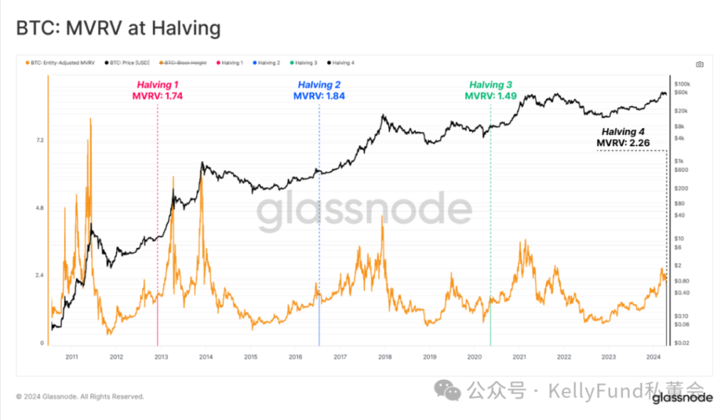 换句话说,截至减半之日,投资者持有相对于其成本而言最大的帐面收益。在当前,MVRV 比率为 2.26,这意味著比特币的平均单位帐面收益为 + 126%。
