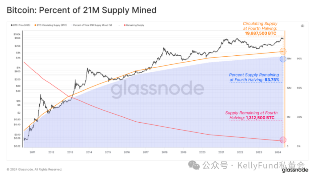 在比特币问世之后的前四个纪元中,共计有 19,687,500 枚比特币被𫔭采出来,相当于预先设定的全网总供应量 2100 万枚的 93.75%。因此,在未来 126 年中只剩下 1,312,500 枚比特币尚待发掘,其中当前纪元(第三次和第四次减半之间)共计发行了 656,600 枚比特币(占总量的 3.125%)。有趣的是,每次减半都代表一个关键点:
