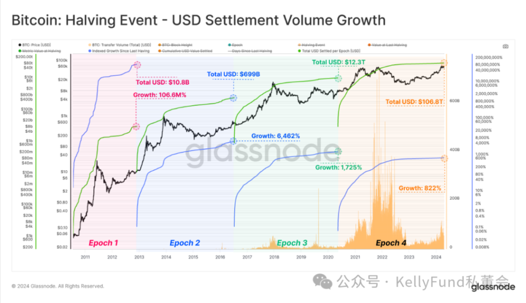 最后,如果我们评估减半时期全网所结算的总转帐交易量,我们可以看到在过去的四年中,网路转帐和结算的总经济量高达 106 兆美元。对此我们需要额外指出的是,这一数值这考虑的是原始的未经过滤的交易量,并且它并未考虑因对钱包内的资产进行内部管理而引发的资料修正。