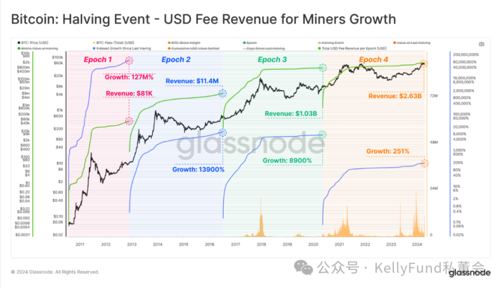 在上一部分中,我们评估了以减半为节点的各个历史周期中的比特币价格表现。而在本节中,我们将把重点转向比特币网路基本面的增长,这些基本面包括𫔭采安全、𫔭采者收入、资产流动性和减半时期的交易结算量。