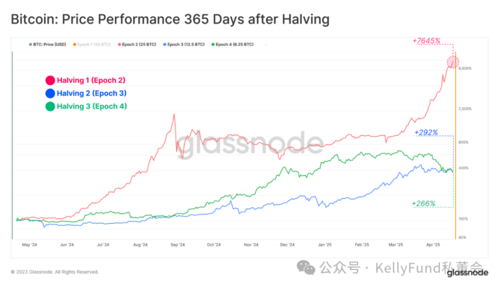 我们的另一个视角是考量每次减半后 365 天内比特币的市场表现。回顾历史,我们发现在第二纪元内,减半所带来的影响要大得多,但我们同时必须考虑到,当今市场的动态和格局相对于 2011-2013 年期间已经发生了显著变化,不能简单地将这两个不同时期的情况等量齐观。