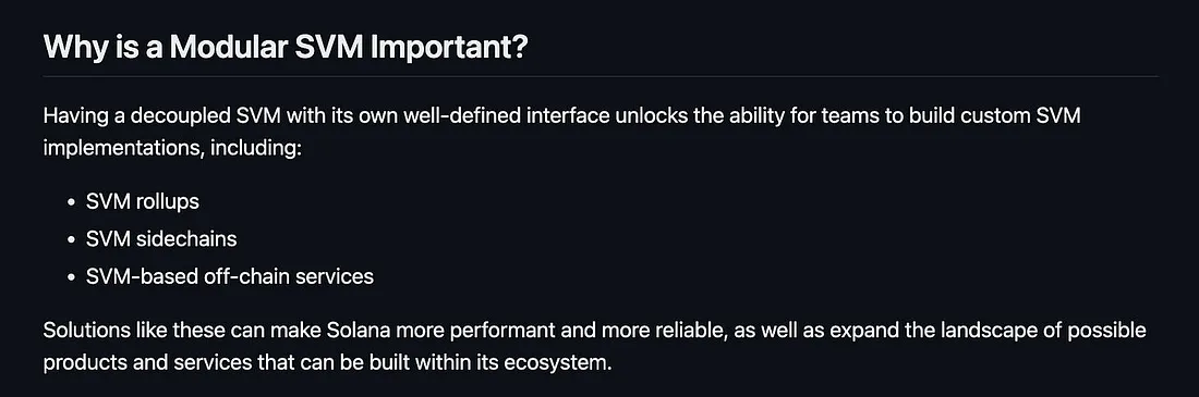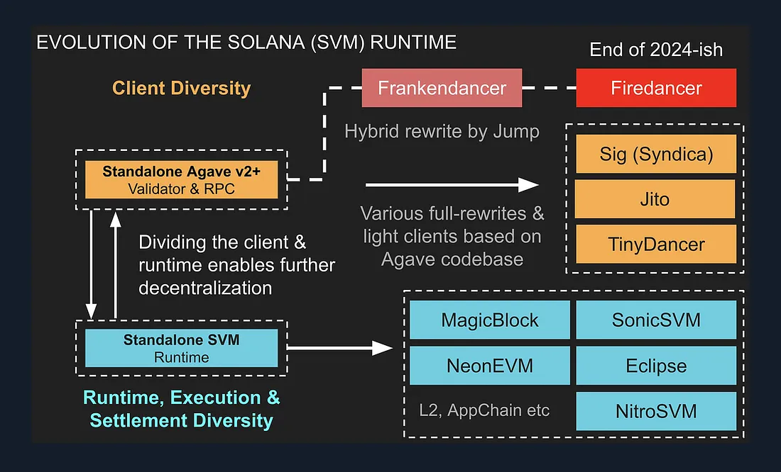 使Solana模块化的努力已经开始。正如Anza DevRel的帖子所示,Solana验证者和SVM(处理交易和智能合约/程序的执行环境)紧密耦合,并由Anza维护。然而,验证者客户端和SVM运行时将在接下来的几个月内分离。这种分离将为分叉SVM和轻松创建提供便利。