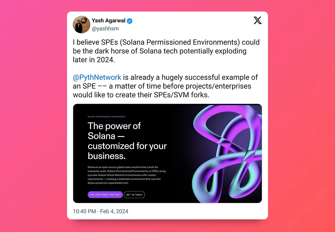 从广义上讲,它可以分为两种类型: 无需许可:任何人都可以加入网络,类似于当前的 Solana 主网 需要许可:由 Solana 基金会打包为“Solana 许可环境(SPEs)”,供机构使用,允许实体构建和维护自己的链实例,由 SVM 提供支持。