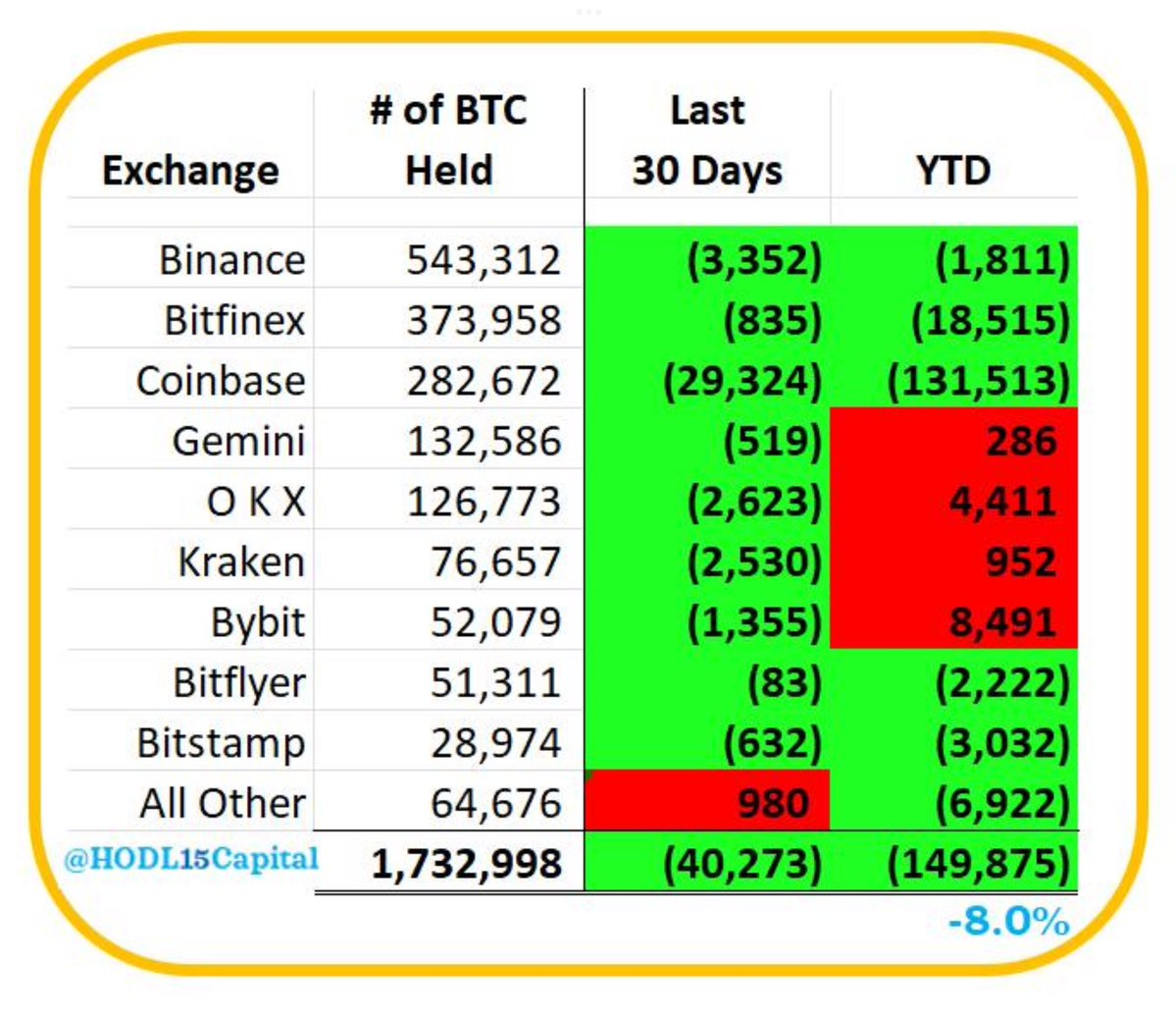 博链财经BroadChain获悉,4月29日,HODL15Capital 数据显示,交易所 比特币 余额创下 6 年来新低,自 2024 年 1 月 1 日以来下降了 8%。