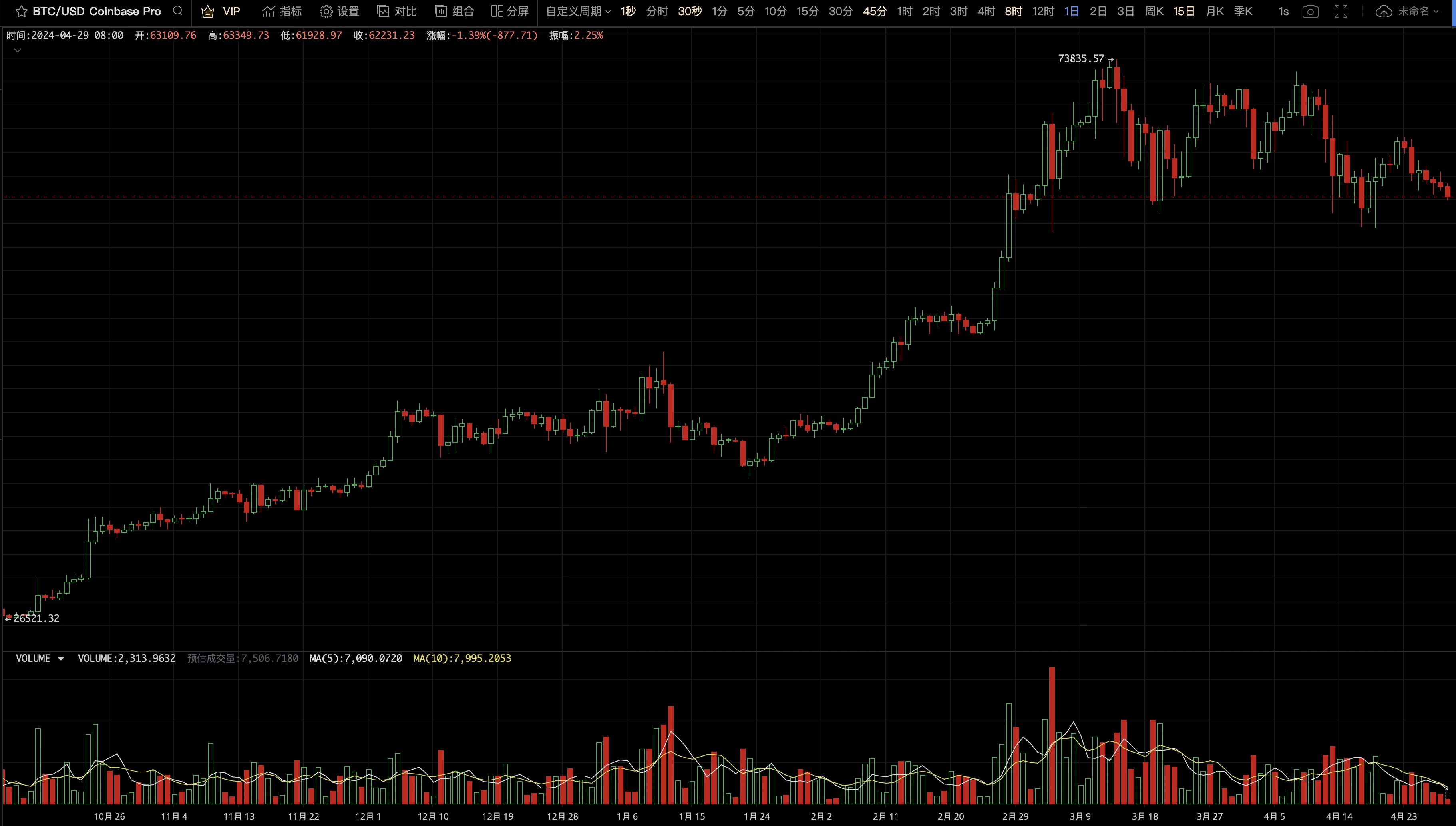 4 月 26 日,美国公布的系列经济数据继续提示通胀持续的风险,市场普遍预期 2024 年降息会推迟到第四季度。受此影响,美元指数大幅反弹。自然的,与美元强负相关的比特币在 2 天内快速回落。