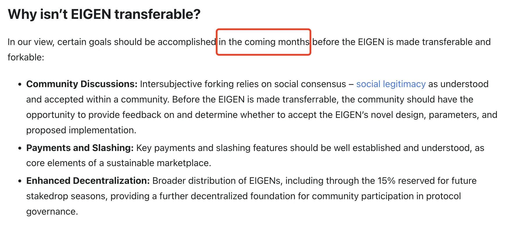 而通过官方文档可知, 预计这一不可转账的状态将持续数月(in the coming months) ,待完成“社区充分讨论 EIGEN 的补充性质押机制”、“激活 AVS 的付款及罚没机制”、“代币广泛分发”等事项后再激活转账功能。