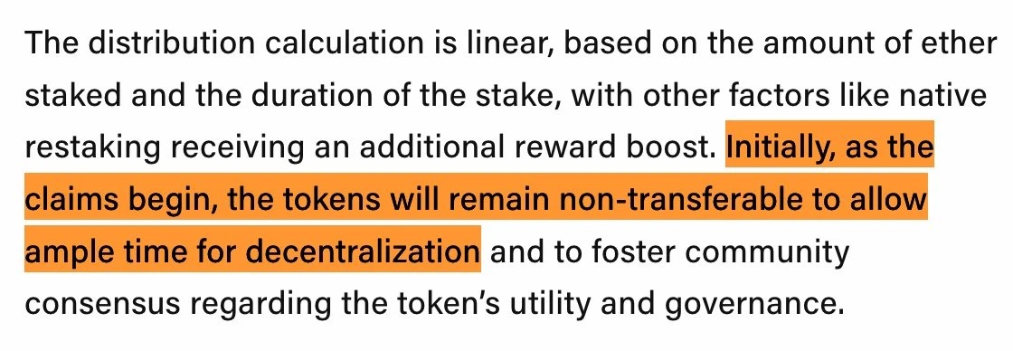 值得强调的是,EigenLayer 在白皮书中已明确提及:为了实现充分的去中心化, EIGEN 代币在申领初期将为不可转账(non-transferable)的状态。