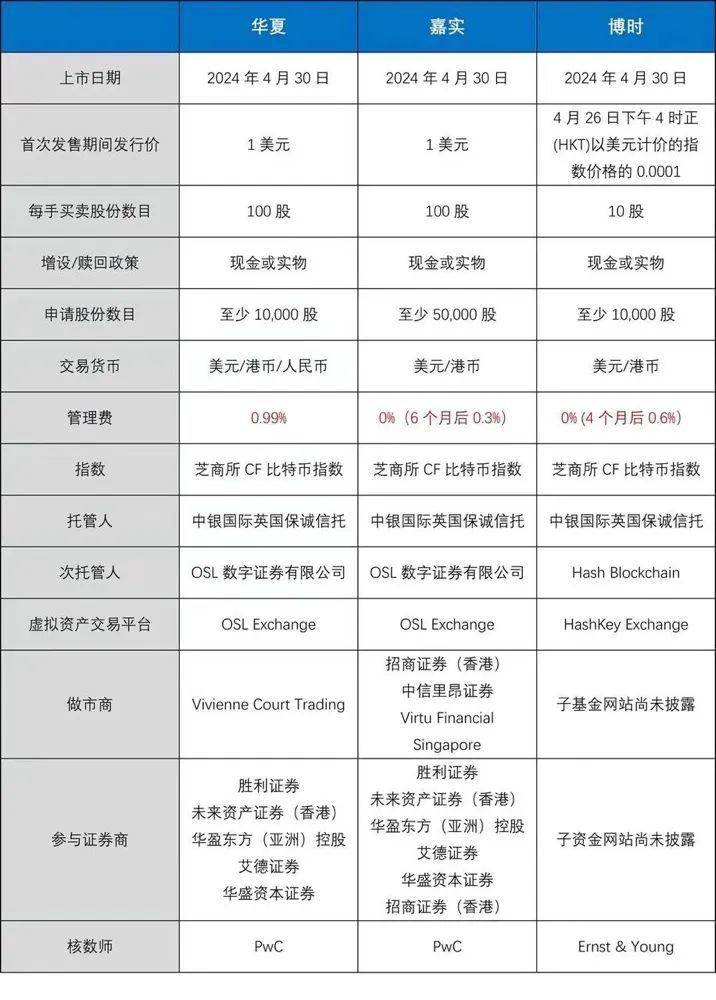 而在前一周,香港证监会(SFC)官网就已列出华夏基金(香港)、博时国际和嘉实国际三家基金公司的比特币和以太坊现货ETF,并陆续披露了发行信息。