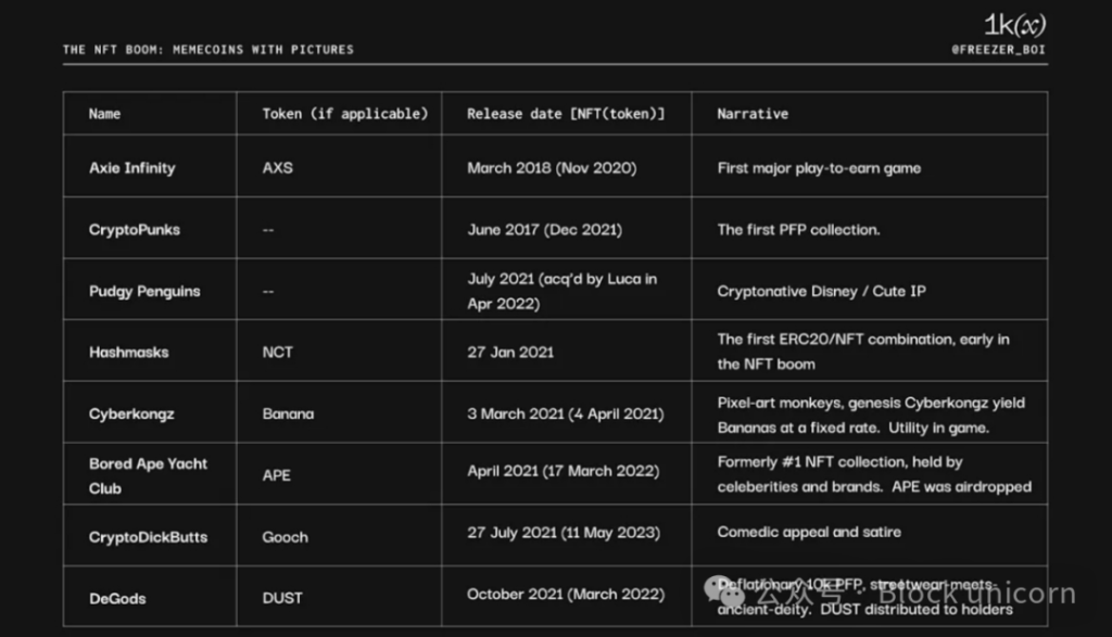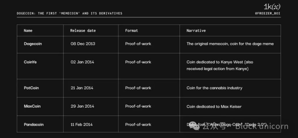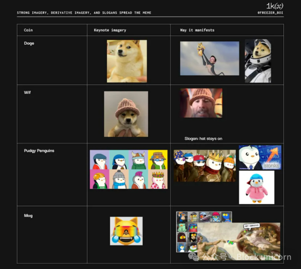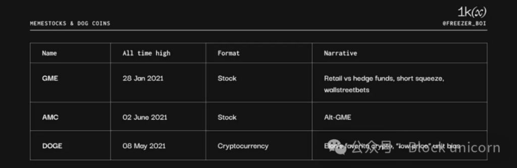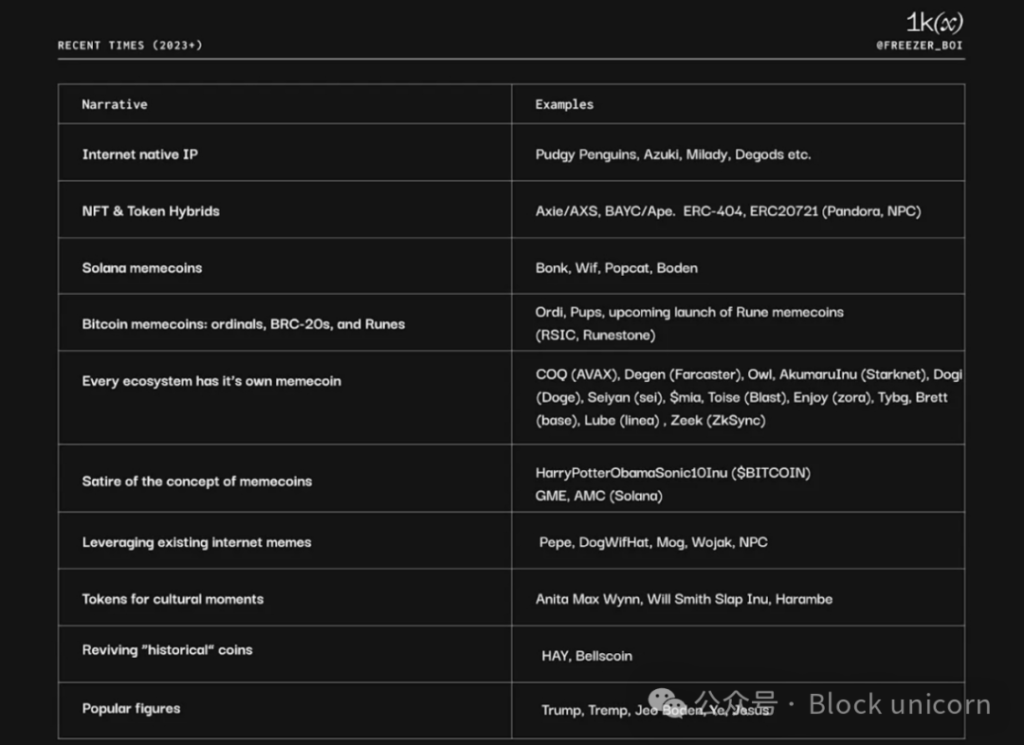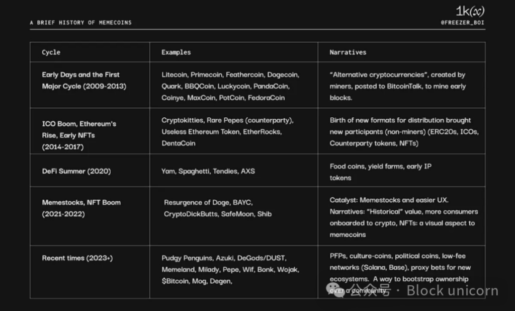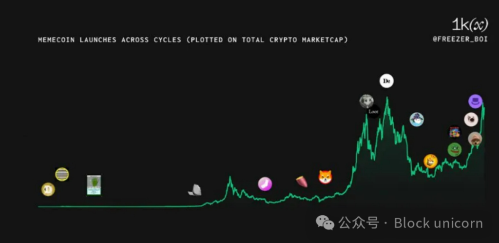 每个周期都会出现某种形式的迷因币,以各种技术形式呈现,如 PoW 币、ERC20 代币和 NFT,利用关注度、叙事和炒作来生存和传播。