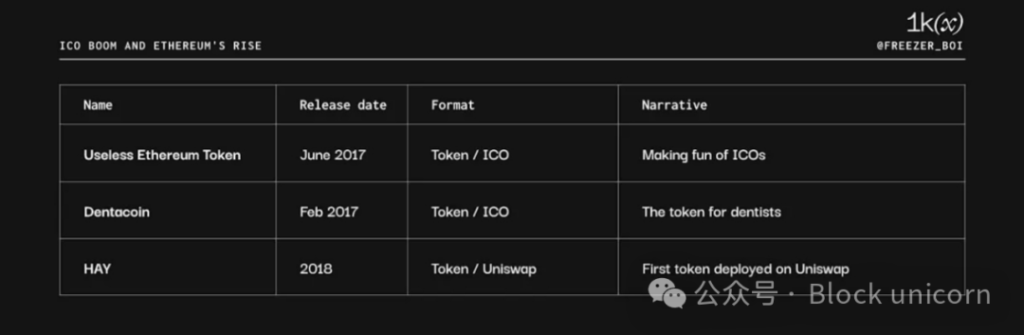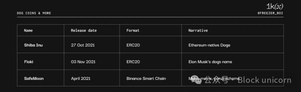 后比特币时代的第一波代币是 「迷因币」,除了新想法之外,它几乎没有提供任何内在价值。上图显示了一些示例: