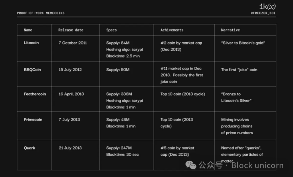 每个迷因币通常都由名称和品牌、hash演算法、区块时间和供应等因素来区分,所有这些因素都有助于其整体得叙事(或 「迷因」)。