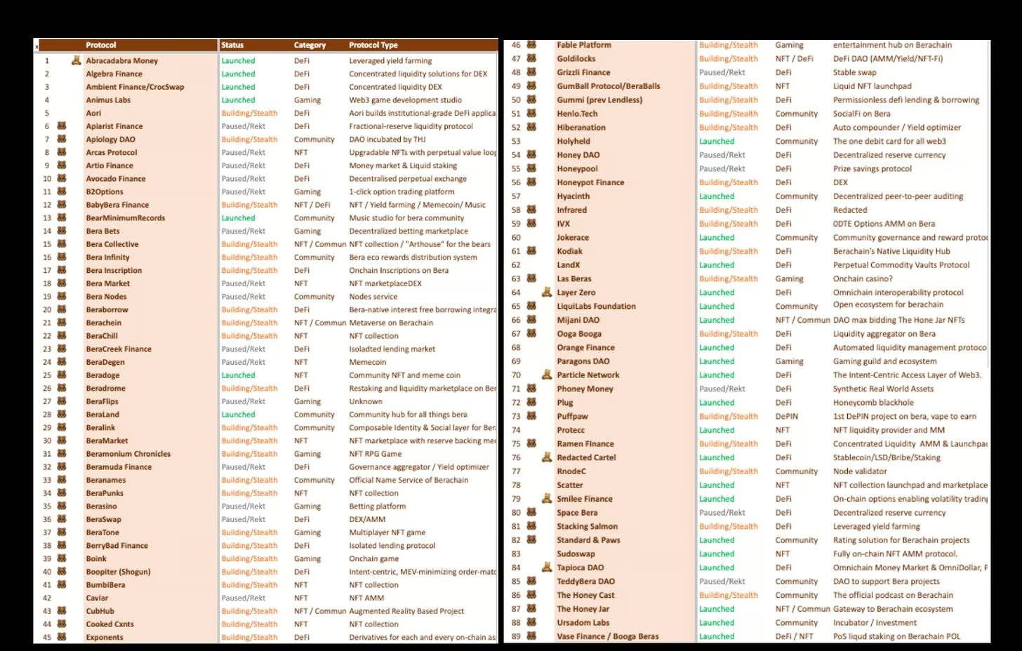 有一个由超过 60 个 Berachain 独家项目组成的丰富社区:从再质押协议、独立游戏、货币市场、NFT AMM、流动性聚合器、发射台等等。此外,还有许多由风投支持的 Berachain 原生项目,包括 Infrared Finance , Kodiak , Beraborrow , Gummi , Beratone 等。