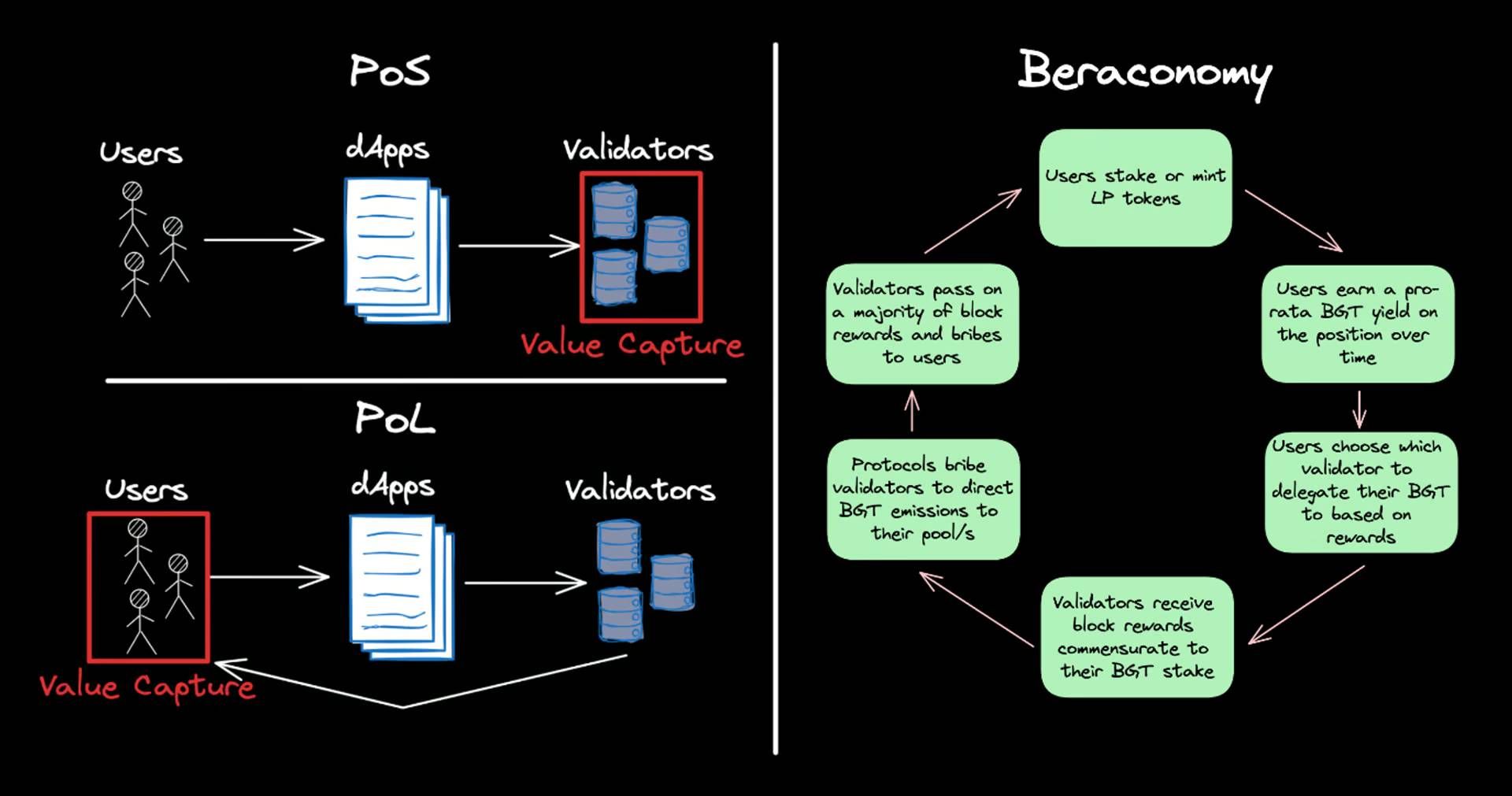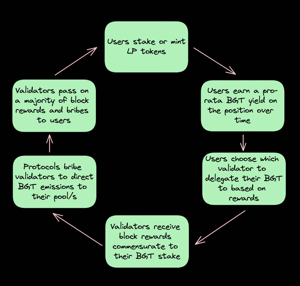 PoL 是一种新颖的奖励机制,用于对齐用户、dApps 和验证者。简而言之,用户持有/铸币 LP 代币并赚取 BGT,这些 BGT 可委托给验证者,验证者可获得与其 BGT 股份相称的区块奖励。因此,安全性直接与流动性挂钩。更具体地,请参考: