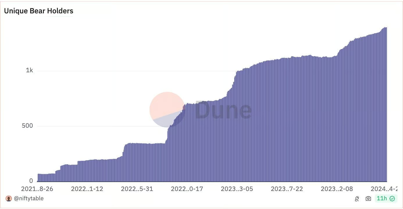 Bong Bear 创世系列及其新版本的市值约为 1.5 亿美元以上,过去 2 年价格、数量和持有量持续增长。