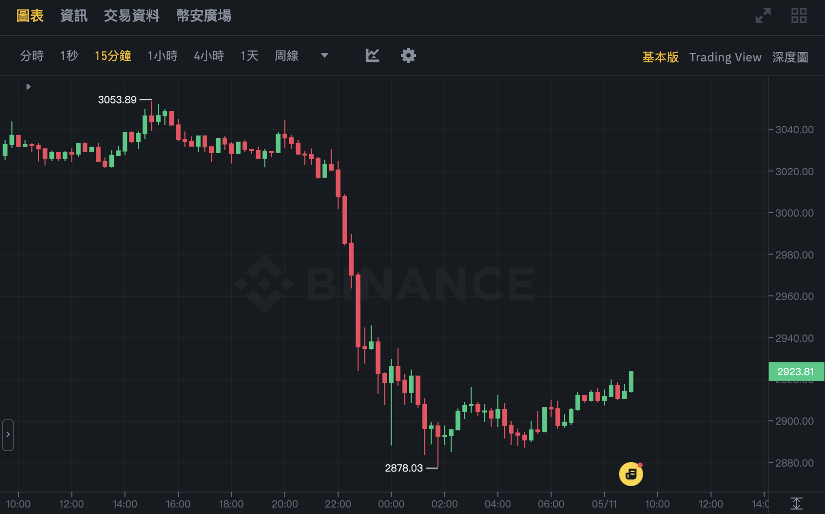 以太坊走势与比特币接近,昨晚 20:00 从 3,044 美元𫔭始剧烈下跌,在今日凌晨 01:45 来到最低 2,878 美元,撰稿当下报 2,923 美元,近 24 小时下跌 3.15%。