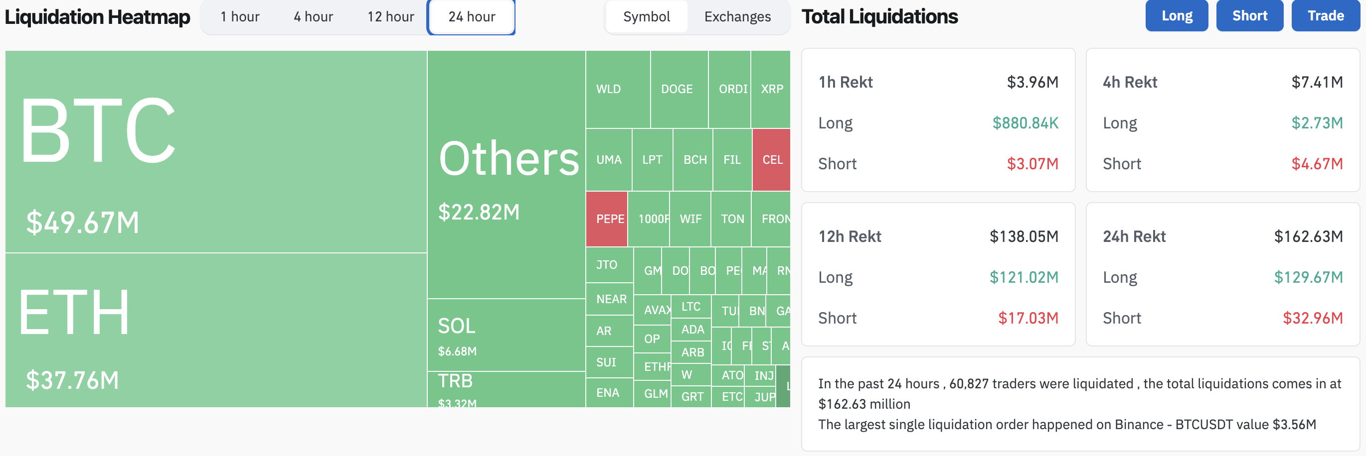 主流币再次下杀的行情,造成投资者大量亏损。据 Coinglass 数据 显示,过去 24 小时,加密货币全网爆仓金额超过 1.6 亿美元,其中绝大部分都是多头,被清算约 1.29 亿美元,有超 6 万人遭清算。