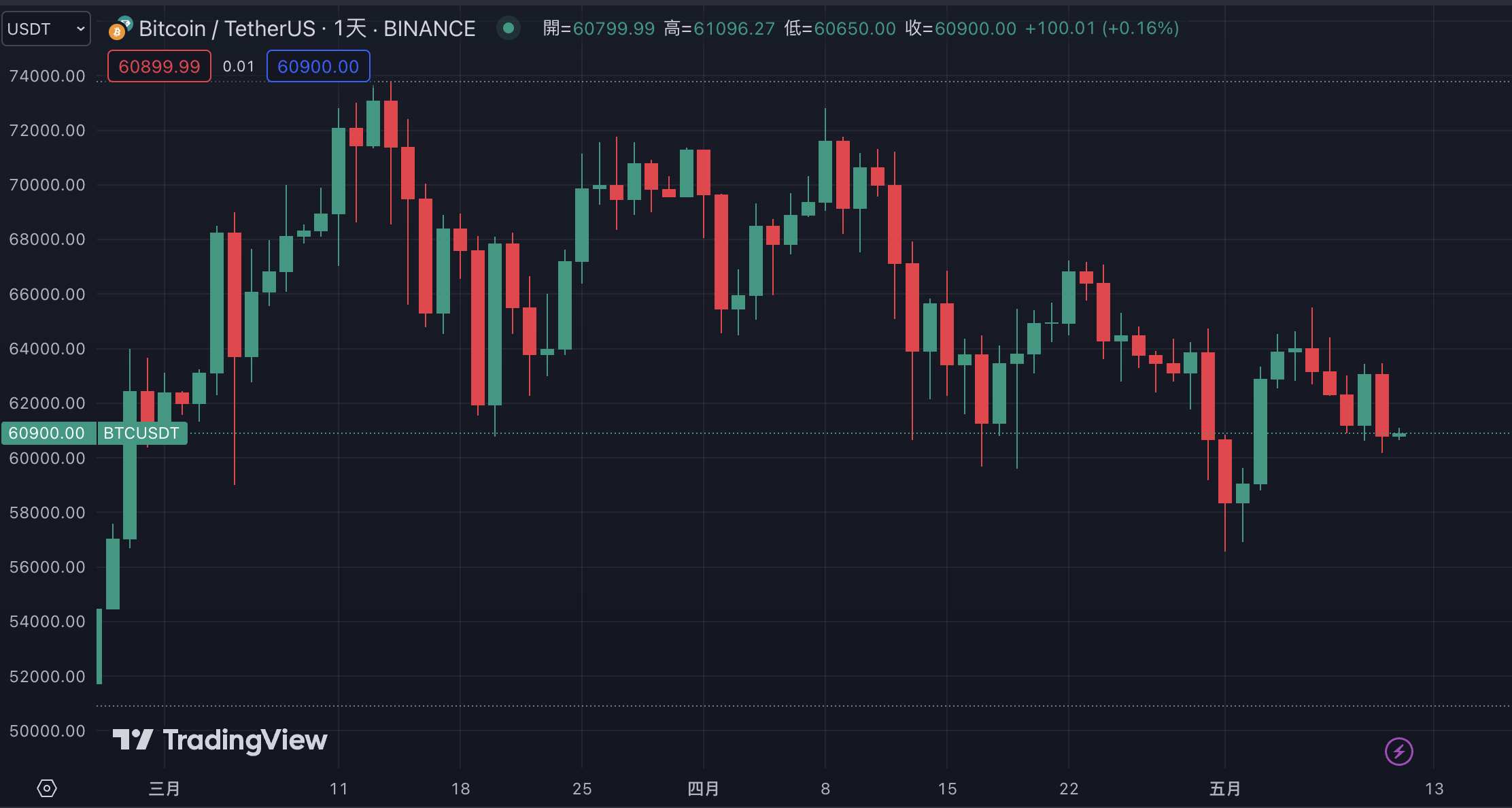 比 特币价格自今年 3 月 14 日创下 73,737 美元的历史新高后,便ㄧ路震盪下跌,在 5 月 1 日一度跌破 56,758 美元,最大回撤约 23%,撰稿当下报 60,900 美元。这样一个横盘下跌的走势已持续约 2 个月,考验著投资者对牛市是否会恢复的信心。