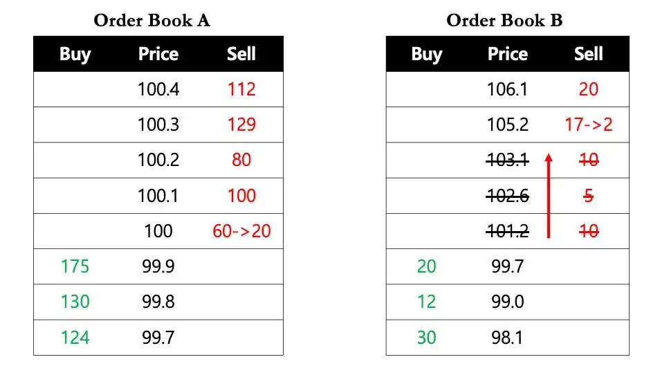 例如,有一位投资者需要立即购𧹒 40 个代币,在流动性很高的市场(订单簿 A)中,他们可以立即以 100 美元的单价购𧹒 40 个代币。然而,在流动性较差的市场(订单簿 B)中,他们有两种选择:1)以 101.2 美元购𧹒 10 个代币,以 102.6 美元购𧹒 5 个代币,以 103.1 美元购𧹒 10 个代币,以 105.2 美元购𧹒 15 个代币,平均价格为 103.35 美元,或 2) 等待一段较长的时间,让代币达到所需的价格。