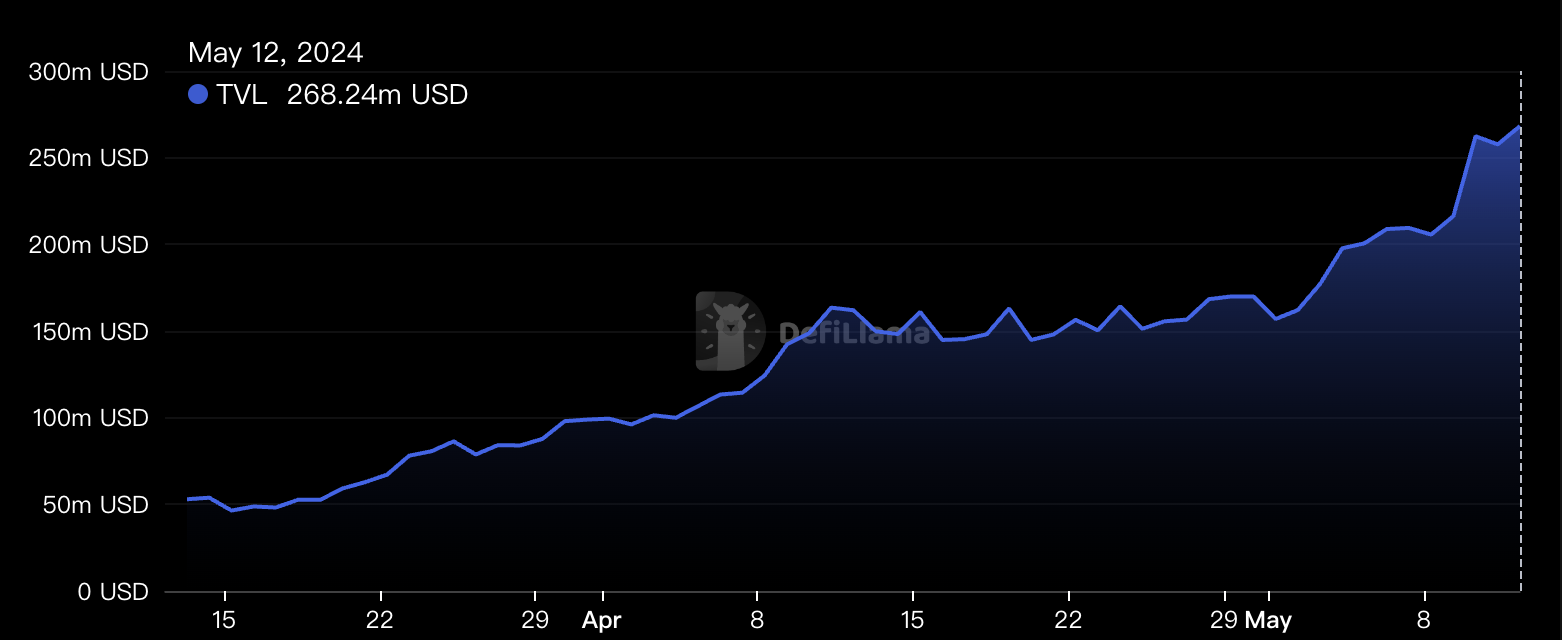 根 据 DefiLlama 的最新数据显示,截至 5 月 12 日,黑马公链 The Open Network (TON)的总锁定价值(TVL)已超过 2.6 亿美元,当前达到 2.68 亿美元。自 5 月以来,TON 上的 TVL 增长了 71.2%,过去 60 天涨幅更高达 415%。