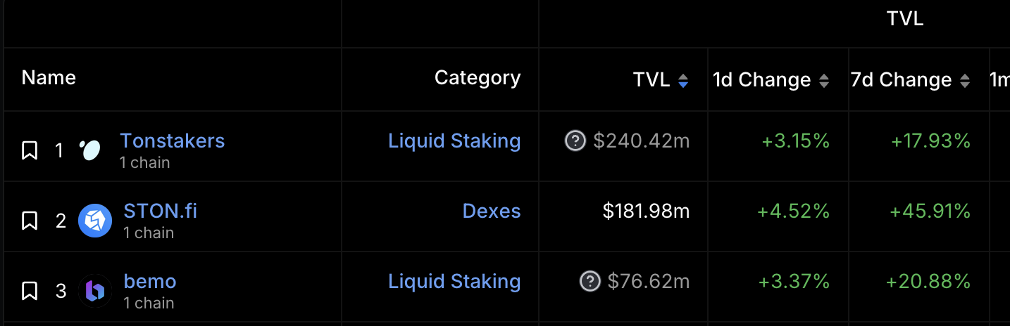 在 TON 生态,主要的流动性质押和交易协议 Tonstakers、DEX 协议 STON.fi 以及流动性质押协议 bemo 是推动 TVL 增长的关键力量。这些协议的一周增幅分别达到了 18%、46 %和 20.8 %。