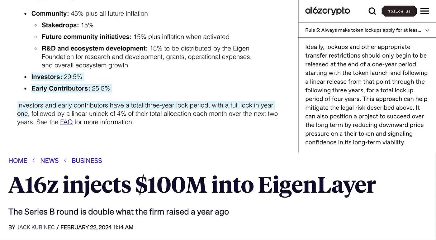 EigenLayer,可以说是这个周期中最大的以太坊协议,是一个经典的例子。内部人士(风投和团队)持有相当大的部分,达 55% ,而最初的社区空投仅为 5% 。这是一个典型的低流通量,高 FDV 的游戏,由拥有 29.5% 股份的风投支持。上一个周期,我们责怪 FTX/Alameda,但这个周期我们也好不到哪儿去。