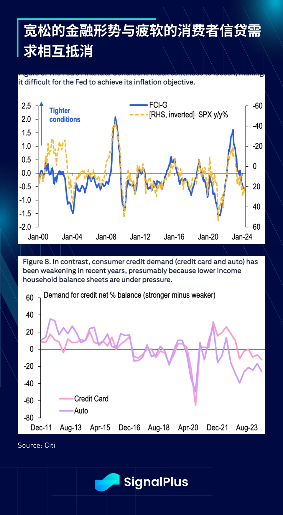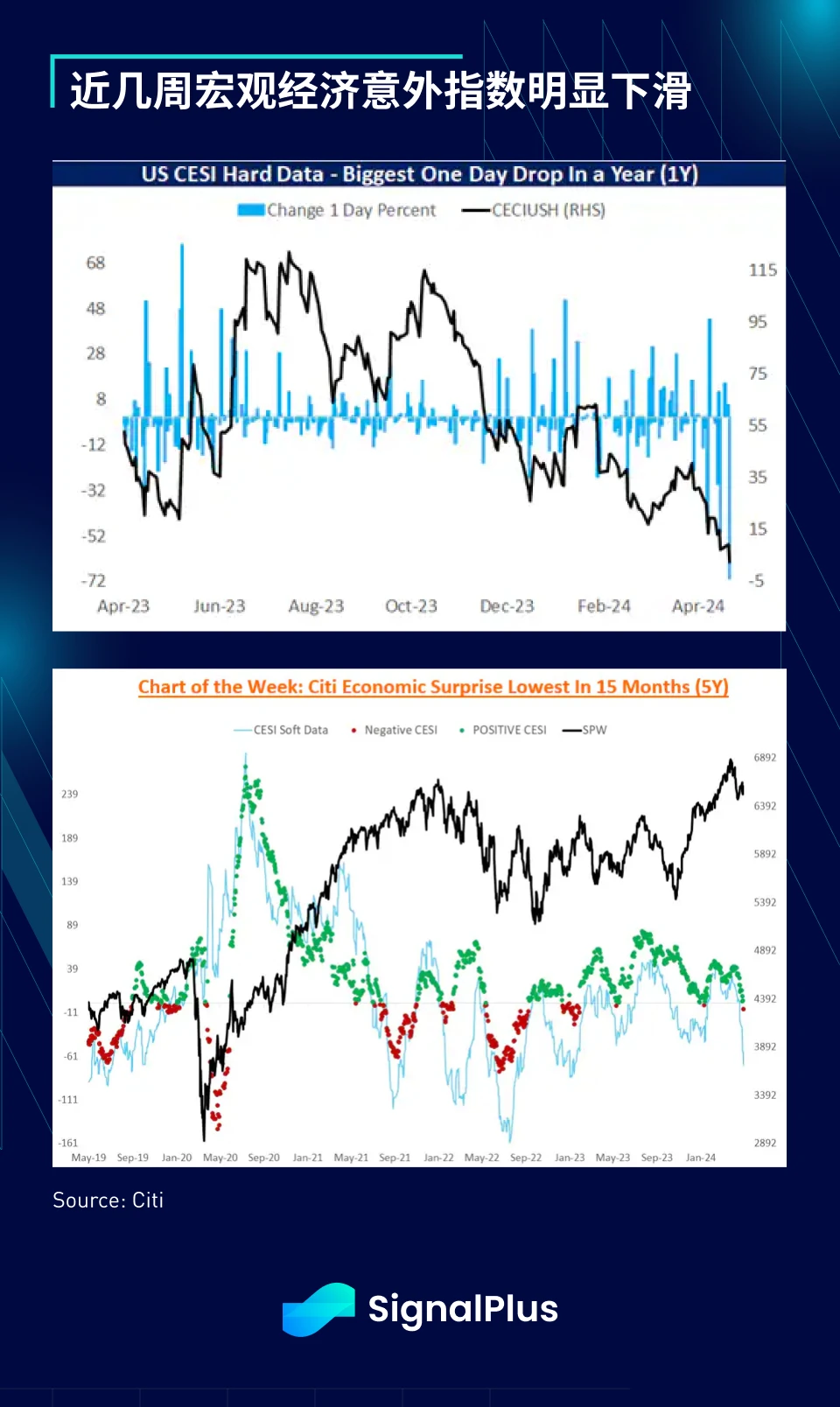整体而言,宏观经济意外指数已跌至 1.5 年来的最低水平,花旗的硬数据指标在上周出现了 1 年来最大单日跌幅。虽然目前断言“硬着陆”还为时过早,但随著消费者储蓄下降、PMI 持续低迷、高利率拖累信贷需求、加上终于放缓的就业市场,美国消费者确实开始进入一个疲软的阶段。