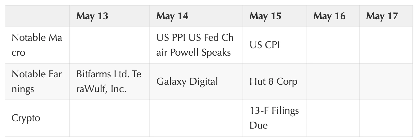 加密货币交易者正在寻找下一个市场催化剂。即将到来的一周,市场将看到美国通胀数据,并听取联邦公开市场委员会(FOMC)主席 Jerome Powell 的讲话。除非在数据上或者主席的语气上出现任何重大意外,否则我们可能会看到波动性继续压缩。由于缺乏明确的宏观或加密货币特定的催化剂,传统市场与加密货币资产之间的相关性可能会继续上升,加密货币将以美国股市为参考。13-F 的申请截止日期是 5 月 15 日,许多公司都会等到最后一刻提交申请。看看谁在美国现货比特币 ETF 中占有一席之地会很有趣。但除非出现一个非常令人惊讶的名字,否则在我们看来,这不太可能是一个影响市场的事件。而关于 ETH,随着 VanEck 现货以太坊 ETF 申请的 5 月 23 日截止日期越来越近,它可能会继续落后。在与交易员交谈时,对批准的期望大都很低。