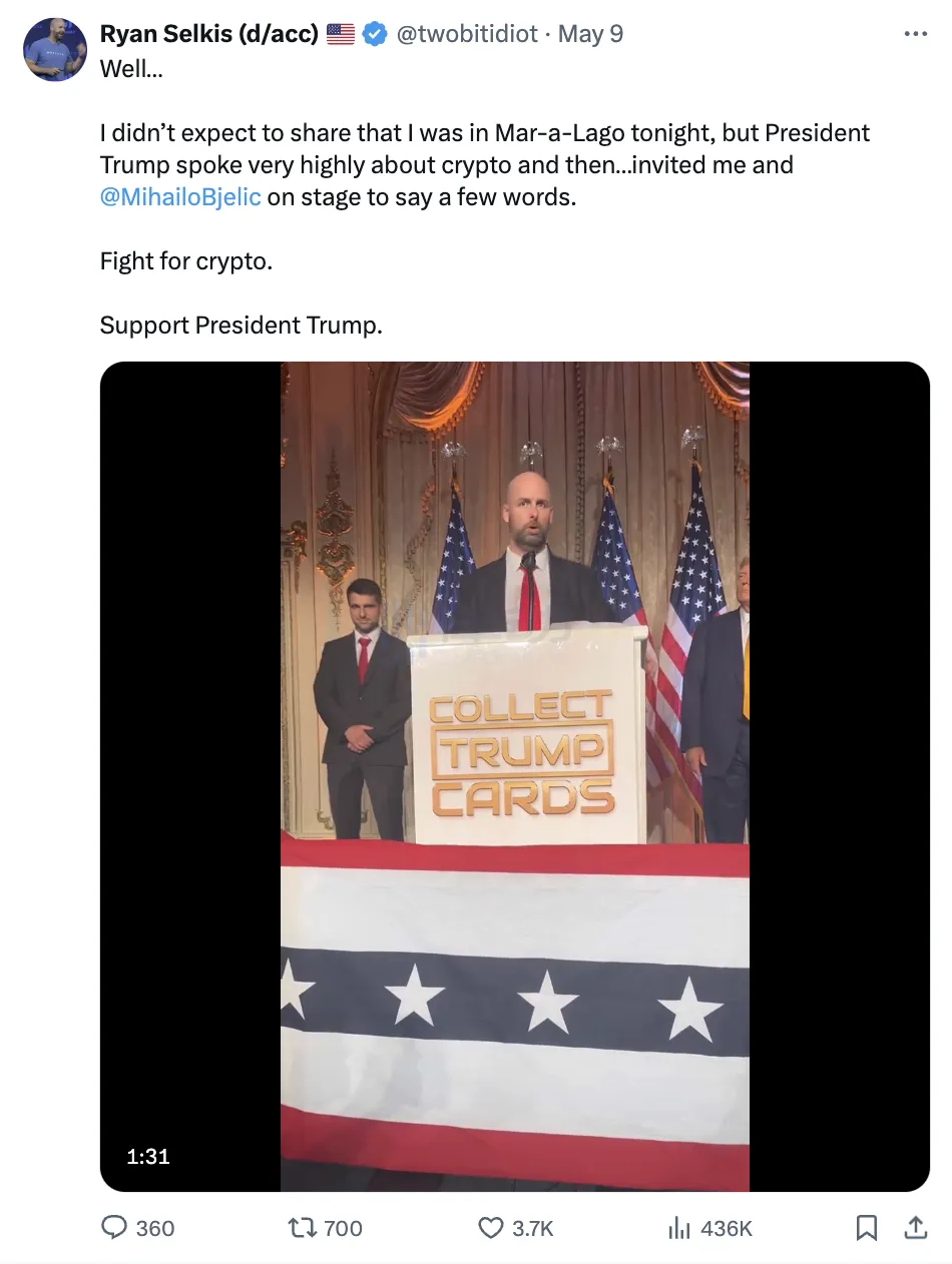 Ryan 随后发布了推文,称「特朗普总统对加密货币评价很高,邀请我和 @MihailoBjelic(Polygon 创始人)上台说几句话。为加密而战。支持特朗普总统。」