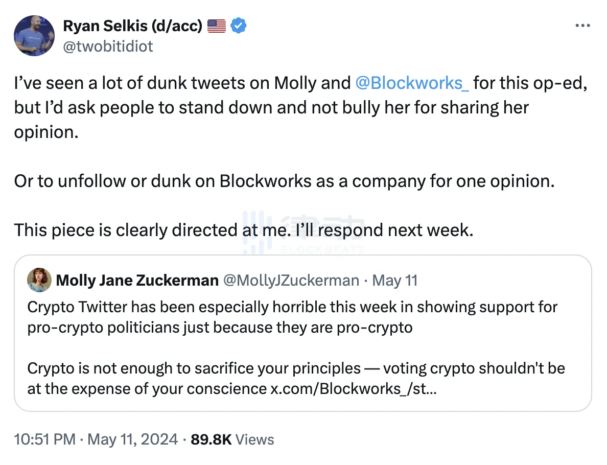 5 月 11 日,加密媒体 Blockworks 作者 Molly Jane Zuckerman 发布了一篇名为《只有傻瓜才会只因为加密货币进行投票》的专栏文章,文章副标题是「美国人不应将自己自私的经济利益置于更广泛的社会和道德问题之上」。