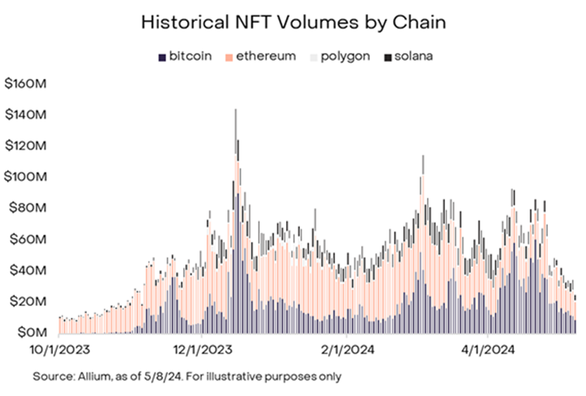 序数本质上是一种引入不可替代性的方法,通过为每个中本聪 ( 即比特币的最小单位 ) 分配一个唯一的数字。通过引用这些数字,可以将图片、音乐或其他任意数据链接到交易的见证部分。到 2023 年底,与所有其他链相比,比特币成为最大的 NFT 平台 ( 基于我们在表 1 中使用的 Allium 的数据 )。