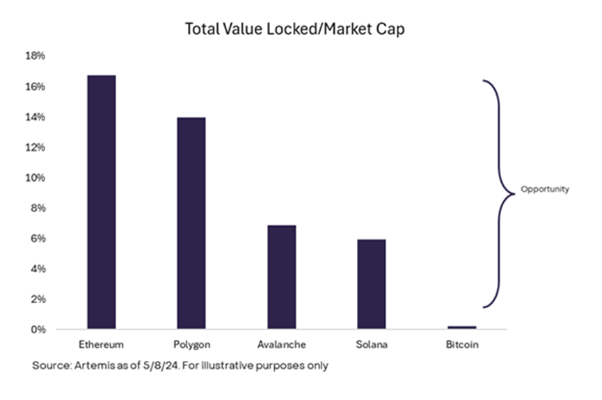 鉴于比特币是智能合约平台市场的一个相对较新的进入者,绘制比特币机会的一种方法是将比特币的利用率和市值与其他智能合约平台的比率进行比较。尽管比特币是市值最大的加密货币,但它的总价值锁定 (TVL) 仍然相对较小,我们可以用它作为利用率的代表。当将比特币的 TVL 与市值比率与较小的链进行比较时,它相对且绝对都较低。