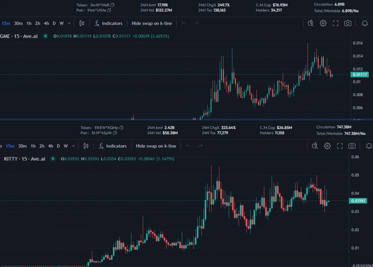 而 Solana 上的同名 Meme 代币也发生了一轮暴涨,领头上涨的包括 GME 和 KITTY,近期最高市值分别为 1 亿美元和 3000 万美元,均在昨日上涨十余倍。而其他 GME 相关同名 Meme 也有不同程度上涨,概念甚至扩展到了 GME 爆仓机构 Melvin Capital 等、