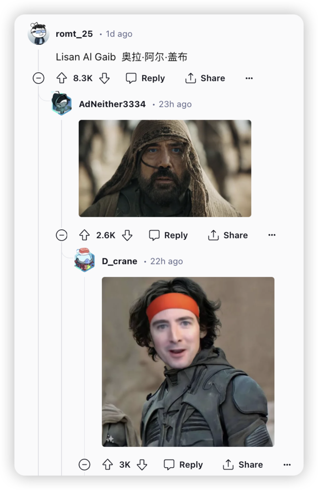 在 X 上,有人引用《沙丘》梗,高呼 Lisan Al Gaib(救世主);《沙丘 II》中男主角甜茶的形象,也被替换成了 Keith Gill 戴着红头巾的经典形象。