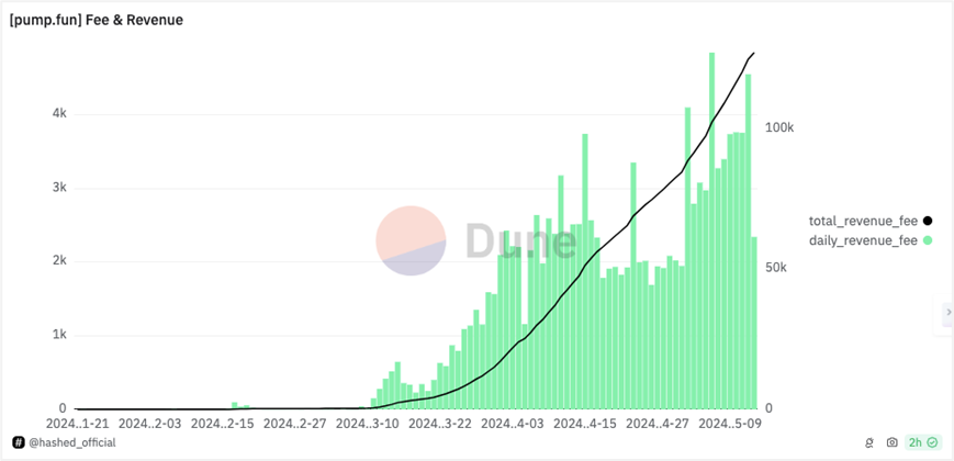 这种简化和低成本的特性使得 Pump.fun 在短时间内迅速受到欢迎,并取得了显著的成就。在过去的 10 天内,Pump.fun 的交易量呈现出抛物线式的增长趋势,创造了总收入近 50% 的增长。目前,平台每日的收益依然保持在 45 万美元以上,并且没有衰减的趋势。