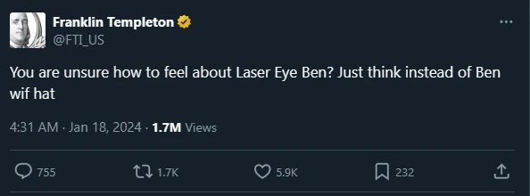 b)Franklin Templeton 持续发表有关 Meme 的文章。 一个有趣的案例是 Franklin Templeton 关于 $WIF 的宣传。
