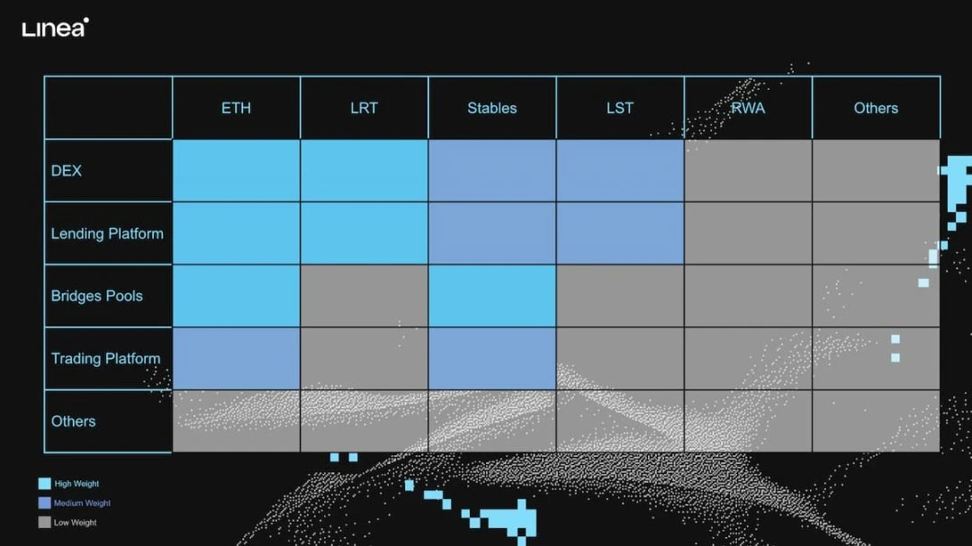 下图展示了生态系统积分奖励的权重情况,针对 DEX 和借贷平台上 ETH 和 LRT 流动性的积分、以及 ETH 跨链活动的奖励权重最高,针对稳定币、LST 以及 RWA 的奖励权重较小。