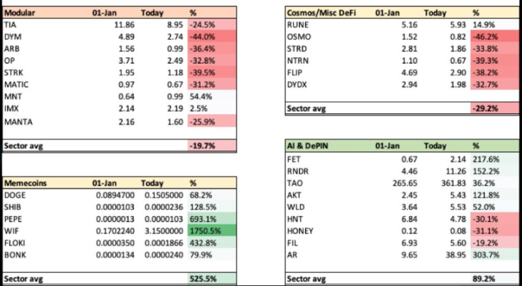知名 Meme 喊单大师 Ansem(@blknoiz 06)迅速对 DonAlt 的看空观点做出回击,并用展示一张过去一年的加密货币数据截图: