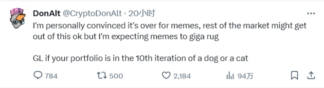 DonAlt 认为 Meme 热潮已经结束,板块即将迎来大暴跌。同时他对其他版块的代币保持乐观态度,最后用带有一丝嘲讽的语气对当前热衷炒作猫狗主题的 Meme 玩家提出「特别忠告」。