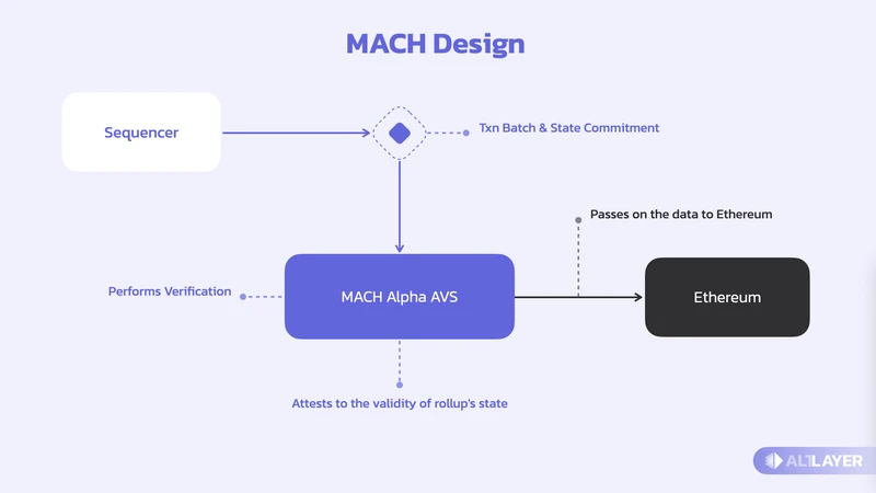 AltLayer 采用 Restaked Rollup 技术,结合 restaking 和 Rollup 技术,增强了区块链的安全性、去中心化和性能。AltLayer 引入了去中心化排序、状态正确性验证和快速最终确定性三个模块化组件:VITAL、MACH 和 SQUAD,分别用于去中心化验证汇总状态、快速最终确定和去中心化定序。MACH 是 AltLayer 针对不同 Rollups 推出的 AVS(Eigenlayer 的 AVS 界面显示 AltLayer MACH),提供快速确认 rollups 交易、加密经济安全(可检测恶意网络参与者)和 rollups 状态的分散验证。