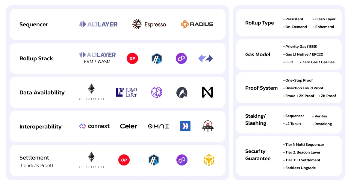 AltLayer 是 Rollups 即服务(RaaS)的提供商,专门部署和管理根据不同应用程序需求定制的 Rollups。AltLayer 已推出并支持 30 多个特定于应用程序的 Rollups,涵盖 OP Stack、Arbitrum Orbit、Polygon CDK、ZKStack 等区块链堆栈,许多都集成了 EigenDA 的 DA 服务。