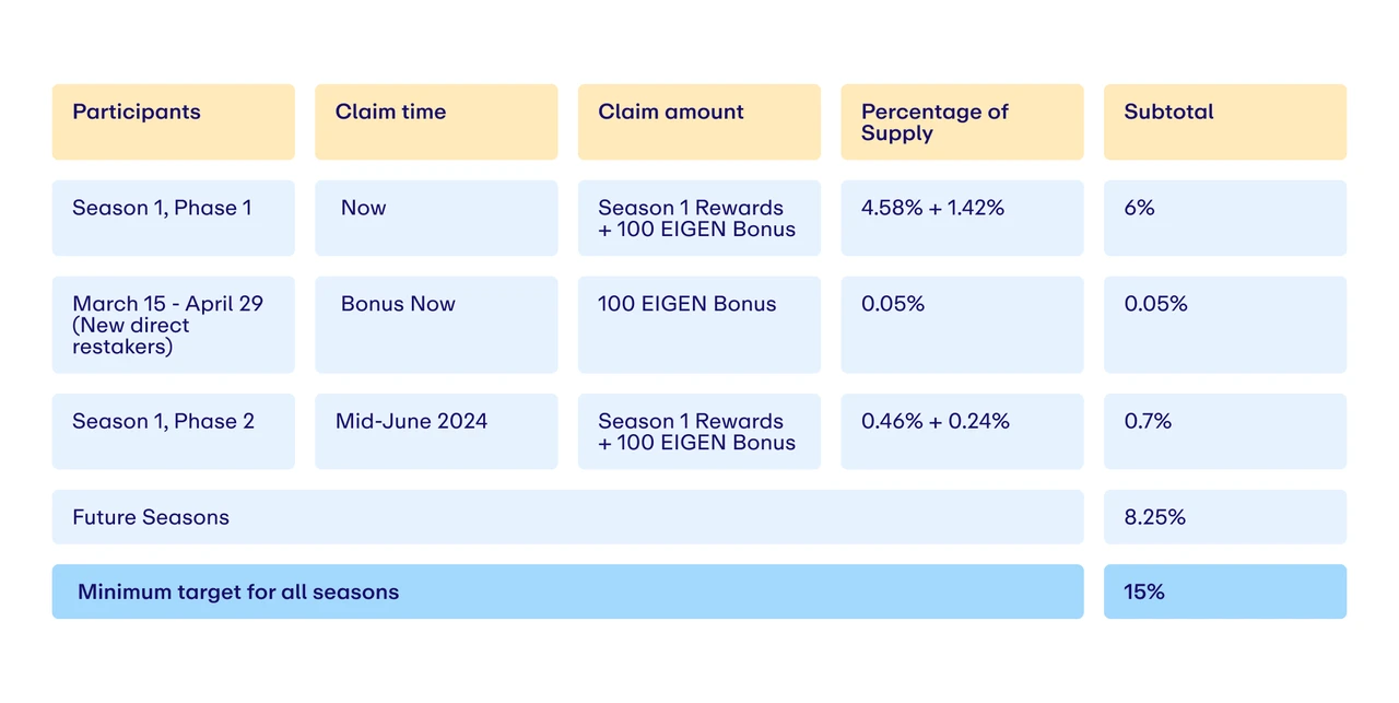第一季共计 1.13 亿枚 EIGEN, 6.05% 初始供应量分配 给第一阶段, 0.7% 代币分配给第二阶段;剩余 8.25% 代币将分配给未来空投季(第一季、第二阶段预计将于 6 月中旬开始)。