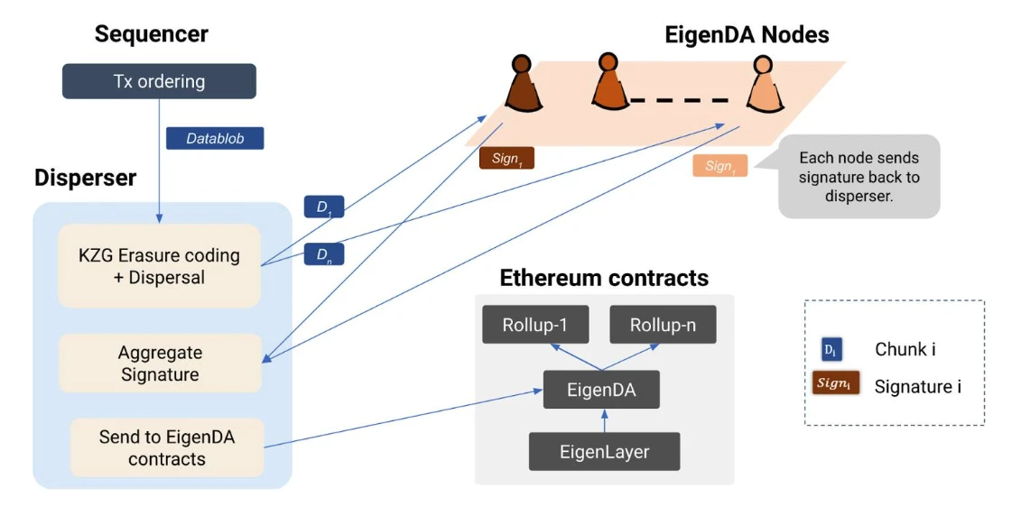 EigenDA 的技术路线基于三个组件:运营商、分散者(不受信任)和检索器(不受信任)。运营商运行 EigenDA 节点软件,负责存储与有效存储请求关联的 blob。分散者由 EigenLabs 托管,负责将 blob 进行 Reed-Solomon 编码,计算编码 blob 的 KZG 承诺,并为每个块生成 KZG 证明。然后分散者将块、KZG 承诺和 KZG 证明发送给运营商,运营商返回签名。分散者聚合这些签名,并以 EigenDA 合约的 calldata 形式上传到以太坊,以惩罚不当行为的运营商。检索器则用于查询 blob 块并验证其准确性,以重建原始 blob。具体实现流程包括:Rollup Sequencer 创建 data blob 并向分散者请求拆分,分散者对 data blob 进行编码并生成 KZG 证明,将数据块、KZG 承诺和 KZG 证明发送至 EigenDA 节点进行验证和签名,最终将签名聚合上传至以太坊主网的 EigenDA 合约中。