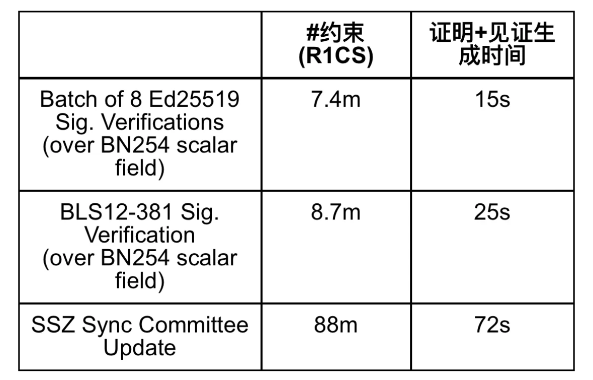 下表总结了一些关键电路性能基准数据(数据由 20 核、 2.3 GHz、 384 GB 内存的 Linux 服务器取得,测试未使用 GPU 加速)。 使用这些 ZK 轻客户端电路,实现了一个面向用户、支持 Ethereum Goeril 和 BNB Chain 之间跨链的资产 zkBridge。