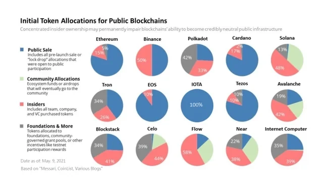 然而,对比2017-2020年时期代币分配的快照,看看红色阴影部分——那是内部人士(团队+投资者)所拥有的比例。 SOL 48%、AVAX 42%、BNB 50%、STX 41%、NEAR 38%等等。今天情况基本相同。因此,如果理论是“代币在以前不是VC代币,但现在是了”,那么这也与统计数据不符。无论周期如何,资本密集型项目在启动时都存在团队和投资者的过度持股。这些“VC代币”在代币完全解锁后也取得了成功。