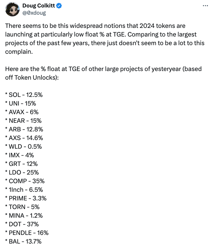 也许你会同意,13% 的流通供应量与过去周期相似。但这仍然太少了,不足以进行价格发现。那么,股票市场没有这个问题?根据X用户@0xdoug提供的数据,2023年IPO首日的流通量中位数为12.8%。