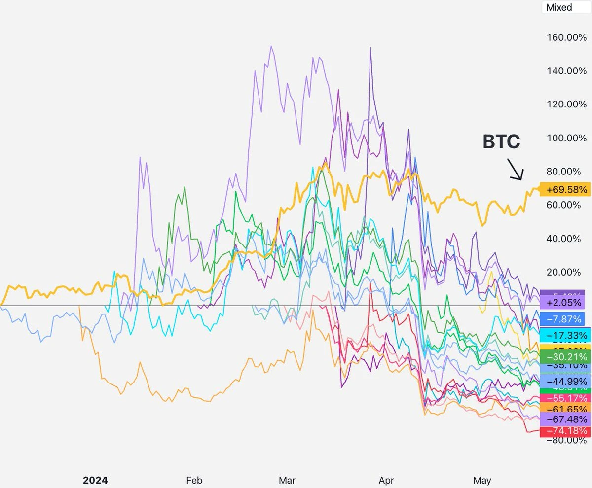 在头几个月,这些币大多都在上市后保持平稳,直到四月中旬。突然之间,伊朗和以色列开始威胁发动第三次世界大战,市场一片混乱。比特币虽然恢复了,但这些币并没有。那么,为什么这些币还在下跌呢?我的解释是:这些新项目都被认为是“高风险新币”。四月份人们对“高风险新币”这一篮子的兴趣下降了,并且没有恢复。市场决定不再购买它们。