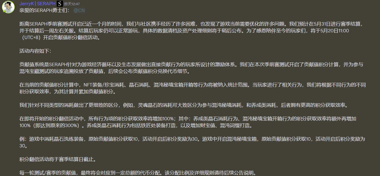 最新动态: 5 月 19 日在官方 Discord 中宣布,预计本次季前赛将于 5 月 31 日结束。同时,于北京时间 5 月 20 日中午 11 点起开启贡献值积分翻倍活动,NFT 装备/珍宝消耗、晶石消耗、混沌秘境宝箱开箱等行为将获得贡献者积分翻倍统计。